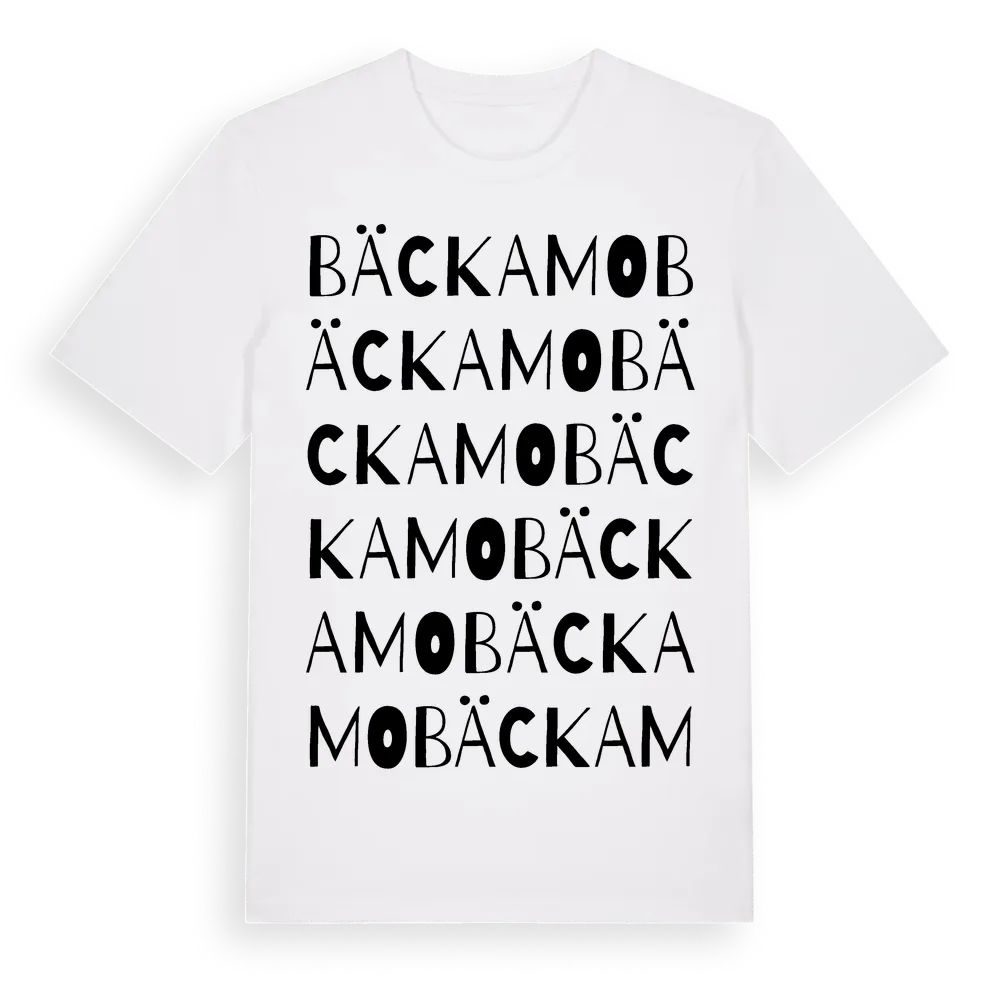 Bäckamo ordlek t-shirt är inspirerad av Bäckamo i Hallands län, Sverige. Tröjan är designad för dig som har en speciell koppling till platsen – oavsett om du bor här, har rötterna här eller bara älskar Bäckamo.