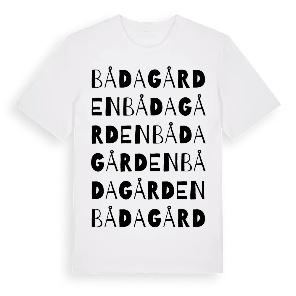 Bådagården ordlek t-shirt är inspirerad av Bådagården i Hallands län, Sverige. Tröjan är designad för dig som har en speciell koppling till platsen – oavsett om du bor här, har rötterna här eller bara älskar Bådagården.