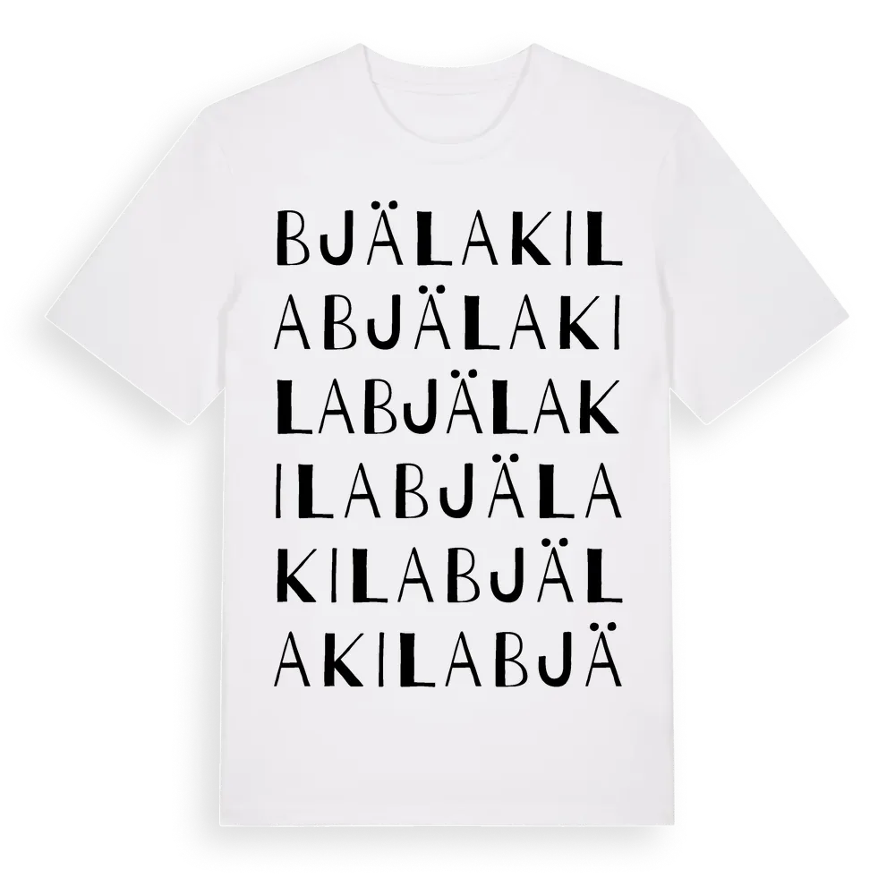 Bjälakila ordlek t-shirt är inspirerad av Bjälakila i Hallands län, Sverige. Tröjan är designad för dig som har en speciell koppling till platsen – oavsett om du bor här, har rötterna här eller bara älskar Bjälakila.