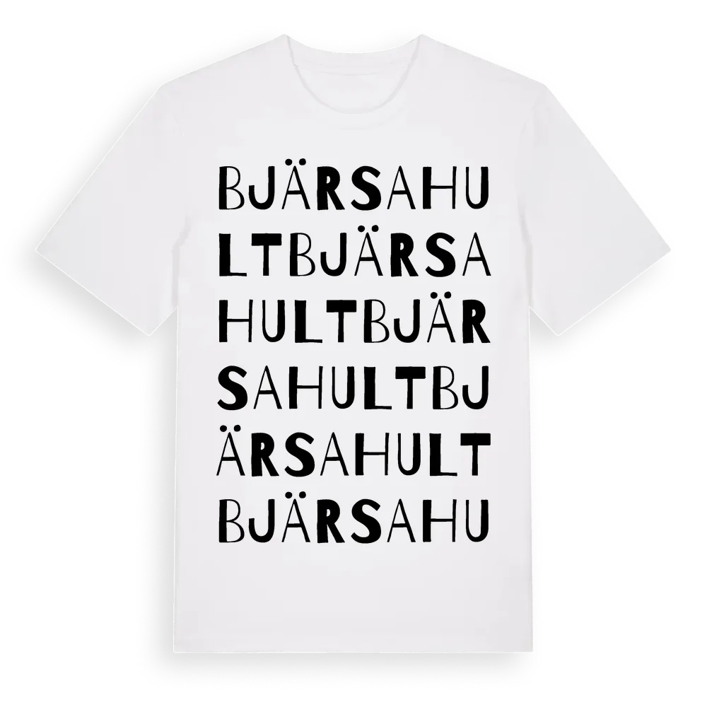 Bjärsahult ordlek t-shirt är inspirerad av Bjärsahult i Hallands län, Sverige. Tröjan är designad för dig som har en speciell koppling till platsen – oavsett om du bor här, har rötterna här eller bara älskar Bjärsahult.