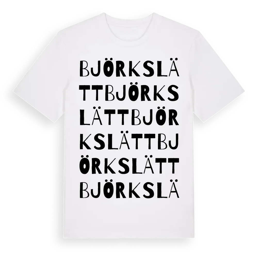 Björkslätt ordlek t-shirt är inspirerad av Björkslätt i Hallands län, Sverige. Tröjan är designad för dig som har en speciell koppling till platsen – oavsett om du bor här, har rötterna här eller bara älskar Björkslätt.