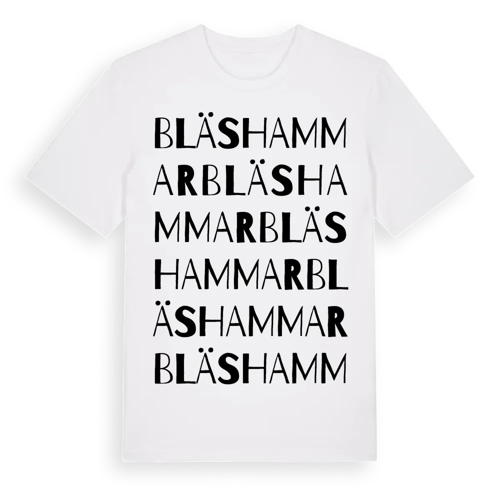 En ordlek byggd på Bläshammars namn. Subtilt och klurig – ett motiv som bara de som verkligen känner platsen fullt ut förstår. Premium bomull, unisex – från byn Bläshammar i Hallands län.