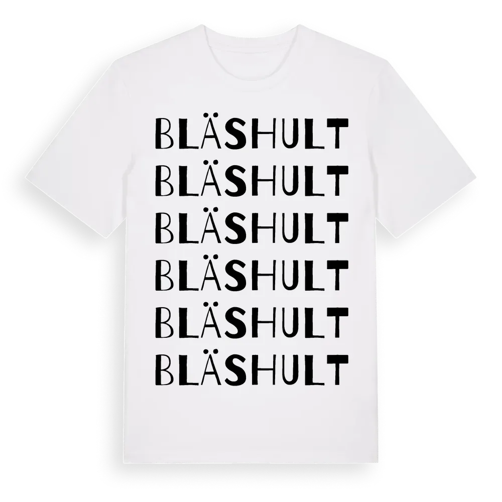 En ordlek byggd på Bläshults namn. Subtilt och klurig – ett motiv som bara de som verkligen känner platsen fullt ut förstår. Premium bomull, unisex – från byn Bläshult i Hallands län.