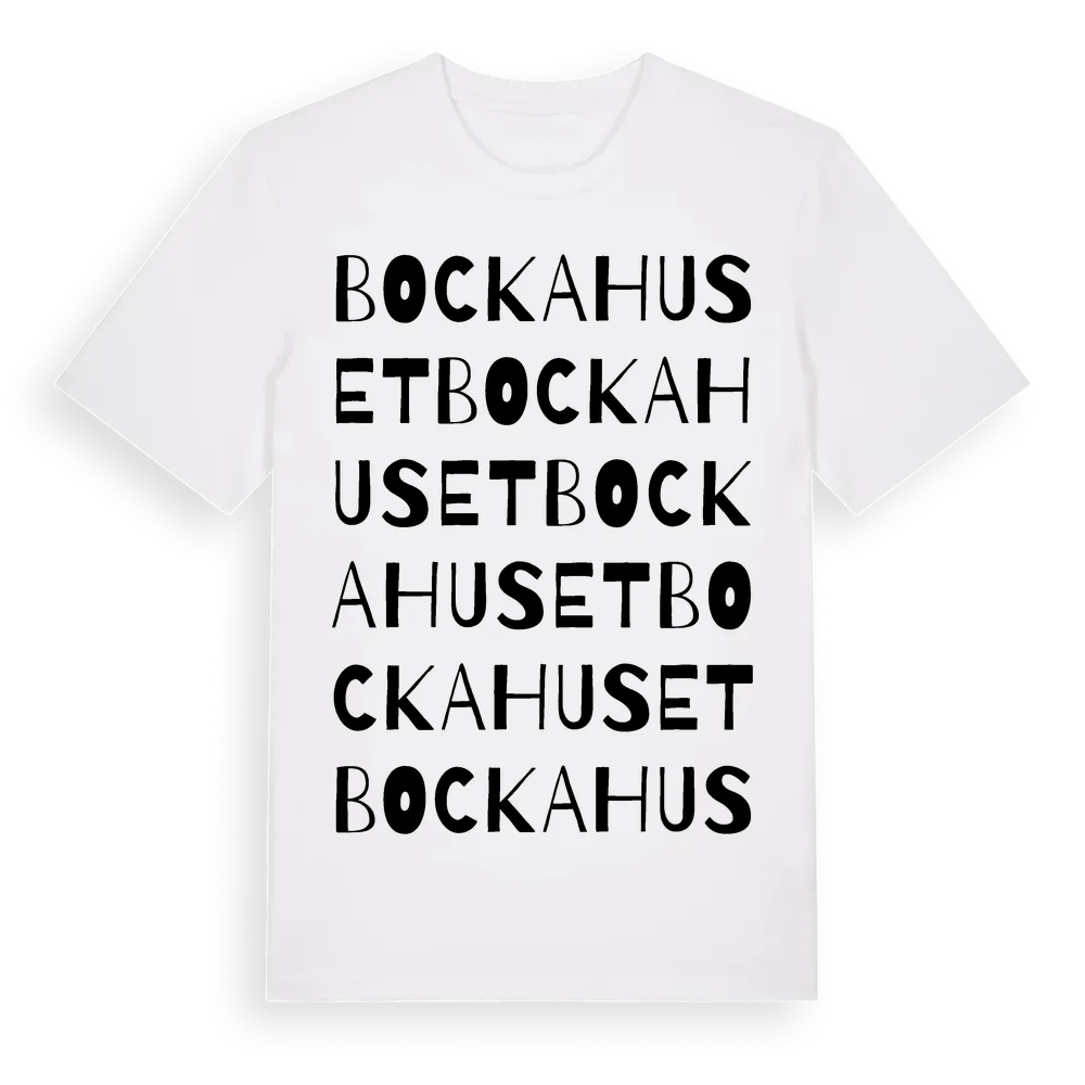 Bockahuset ordlek t-shirt är inspirerad av Bockahuset i Hallands län, Sverige. Tröjan är designad för dig som har en speciell koppling till platsen – oavsett om du bor här, har rötterna här eller bara älskar Bockahuset.