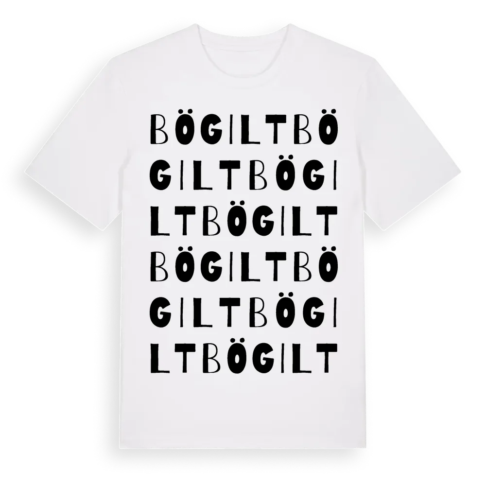 En ordlek byggd på Bögilts namn. Subtilt och klurig – ett motiv som bara de som verkligen känner platsen fullt ut förstår. Premium bomull, unisex – från byn Bögilt i Hallands län.