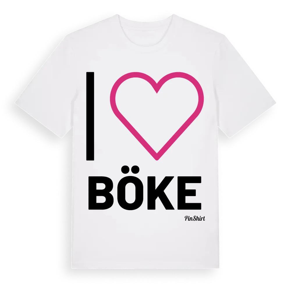 Det klassiska "I ❤ Böke"-motivet i stort format som täcker hela bröstet. För dig som vill visa kärleken till Böke på riktigt. Premium bomull, unisex – från Böke i Hallands län.