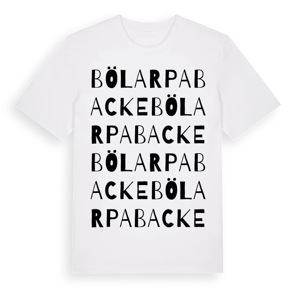 Bölarpabacke ordlek t-shirt är inspirerad av byn Bölarpabacke i Hallands län, Sverige. Tröjan är designad för dig som har en speciell koppling till platsen – oavsett om du bor här, har rötterna här eller bara älskar Bölarpabacke.