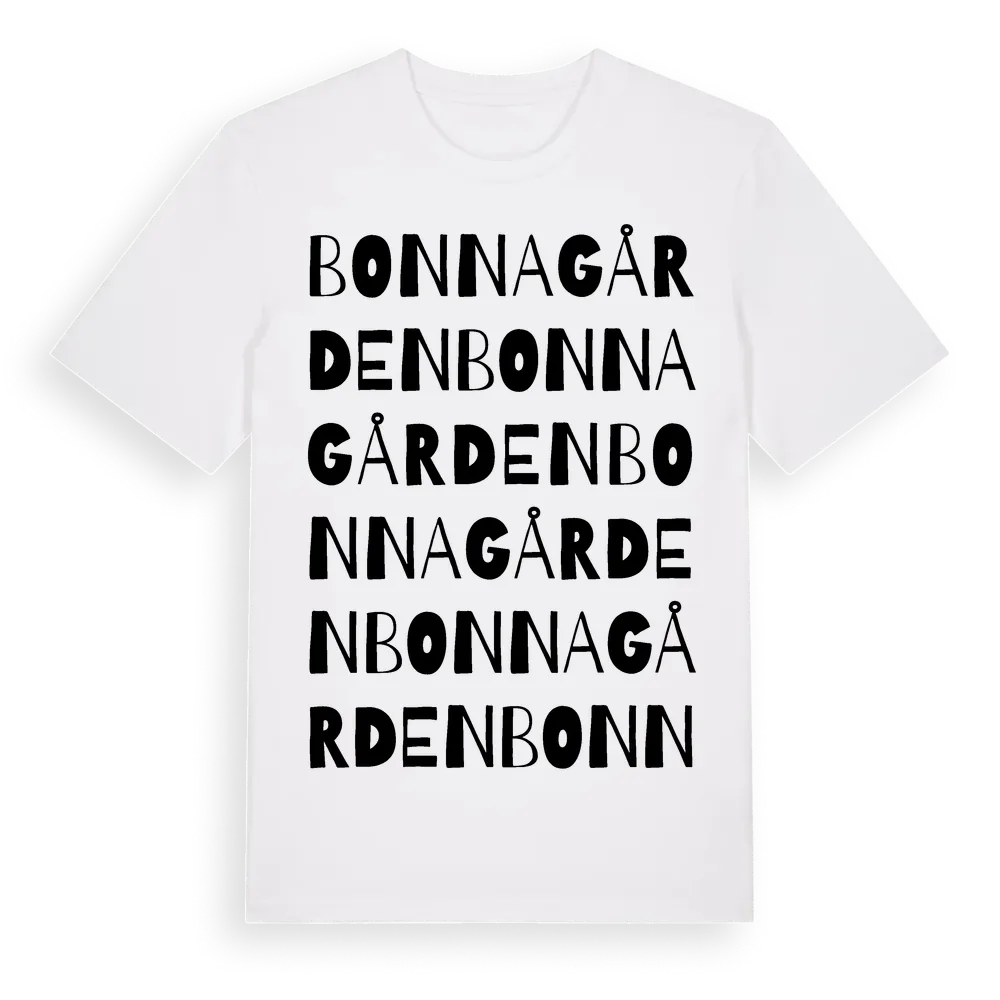 Bonnagården ordlek t-shirt är inspirerad av Bonnagården i Hallands län, Sverige. Tröjan är designad för dig som har en speciell koppling till platsen – oavsett om du bor här, har rötterna här eller bara älskar Bonnagården.