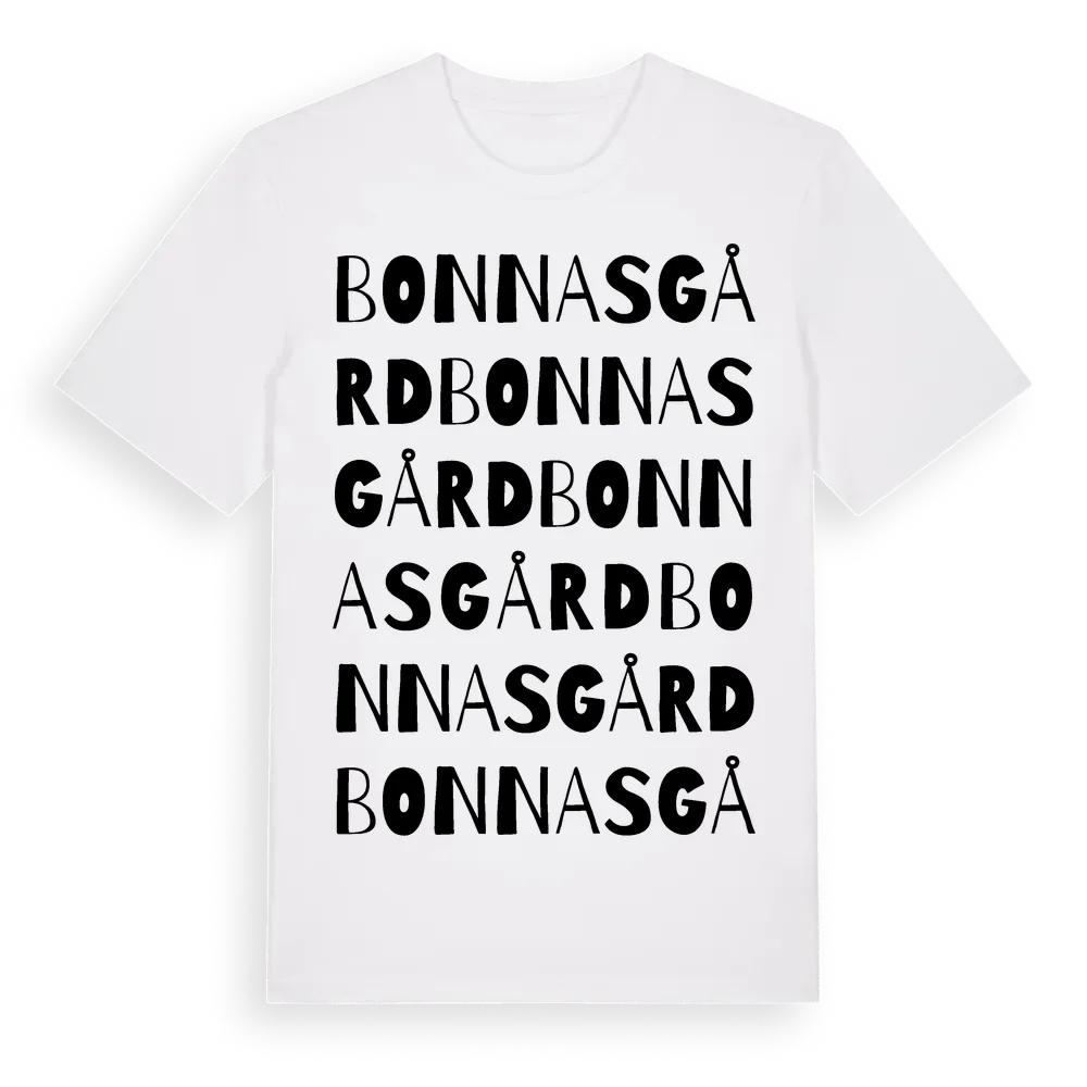 Bonnasgård ordlek t-shirt är inspirerad av Bonnasgård i Hallands län, Sverige. Tröjan är designad för dig som har en speciell koppling till platsen – oavsett om du bor här, har rötterna här eller bara älskar Bonnasgård.