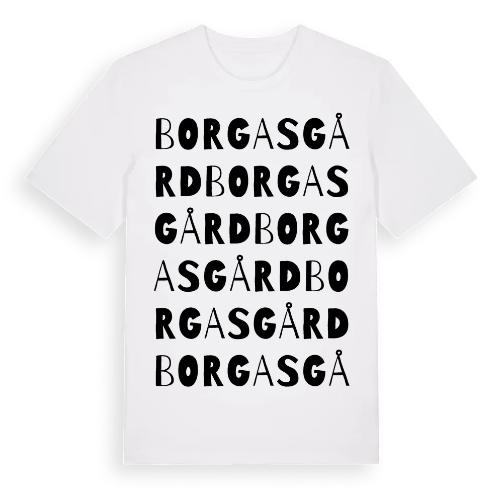 Borgasgård ordlek t-shirt är inspirerad av Borgasgård i Hallands län, Sverige. Tröjan är designad för dig som har en speciell koppling till platsen – oavsett om du bor här, har rötterna här eller bara älskar Borgasgård.