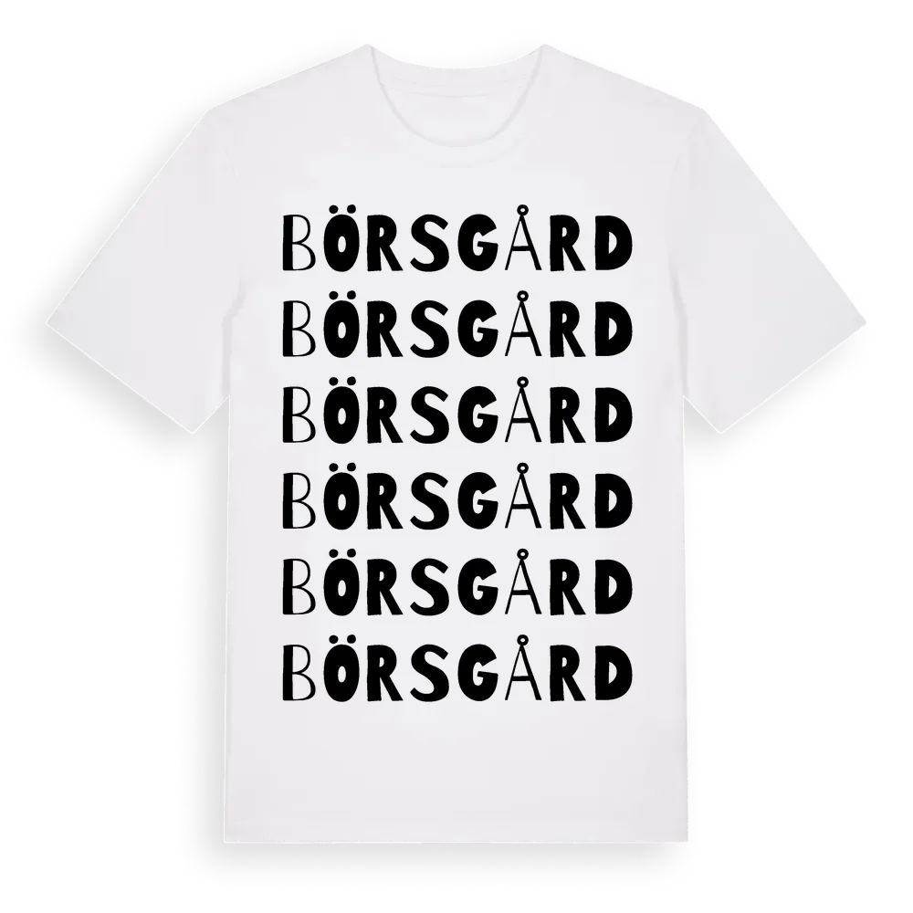 Börsgård ordlek t-shirt är inspirerad av Börsgård i Hallands län, Sverige. Tröjan är designad för dig som har en speciell koppling till platsen – oavsett om du bor här, har rötterna här eller bara älskar Börsgård.