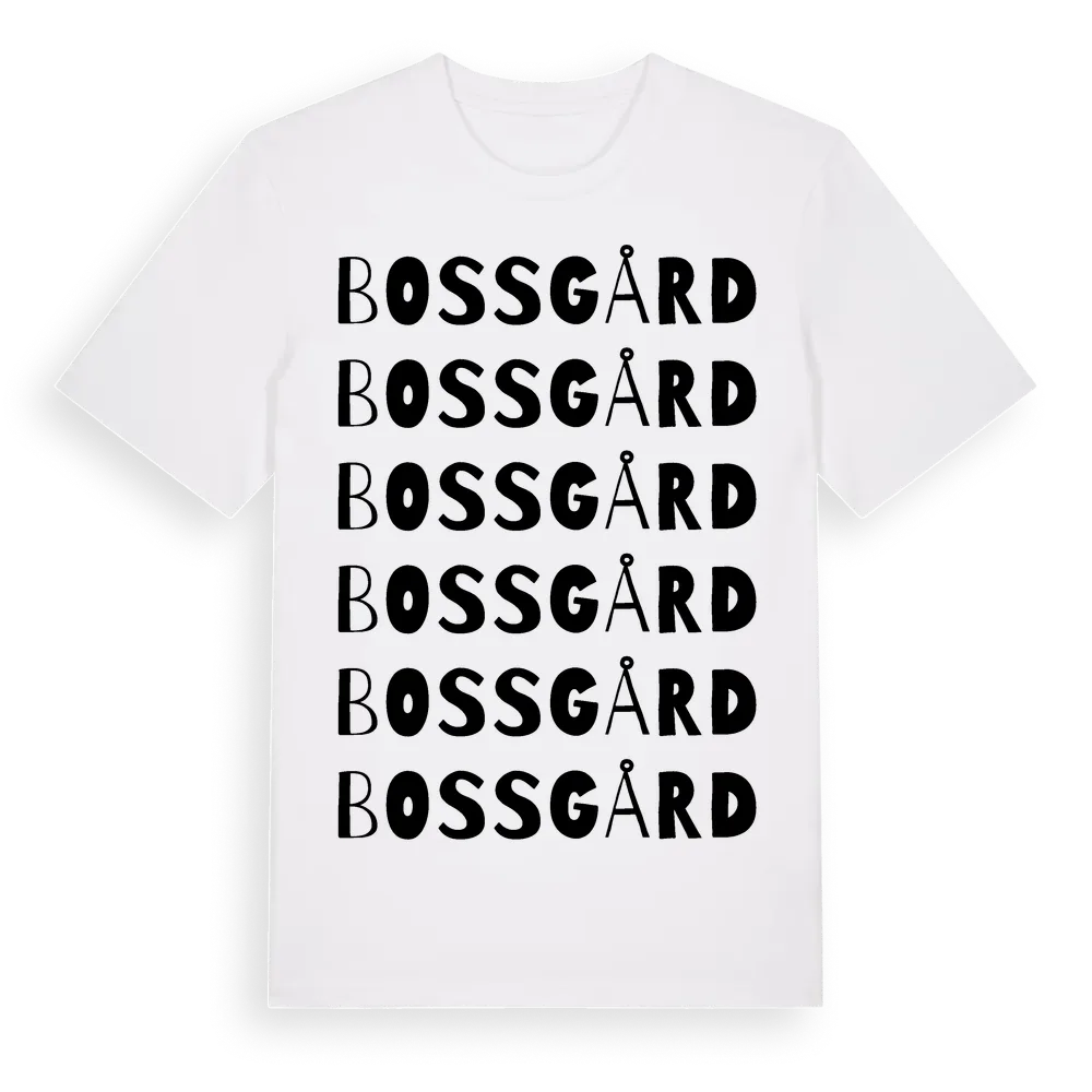 Bossgård ordlek t-shirt är inspirerad av Bossgård i Hallands län, Sverige. Tröjan är designad för dig som har en speciell koppling till platsen – oavsett om du bor här, har rötterna här eller bara älskar Bossgård.