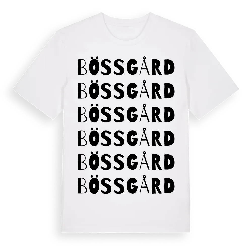 Bössgård ordlek t-shirt är inspirerad av Bössgård i Hallands län, Sverige. Tröjan är designad för dig som har en speciell koppling till platsen – oavsett om du bor här, har rötterna här eller bara älskar Bössgård.
