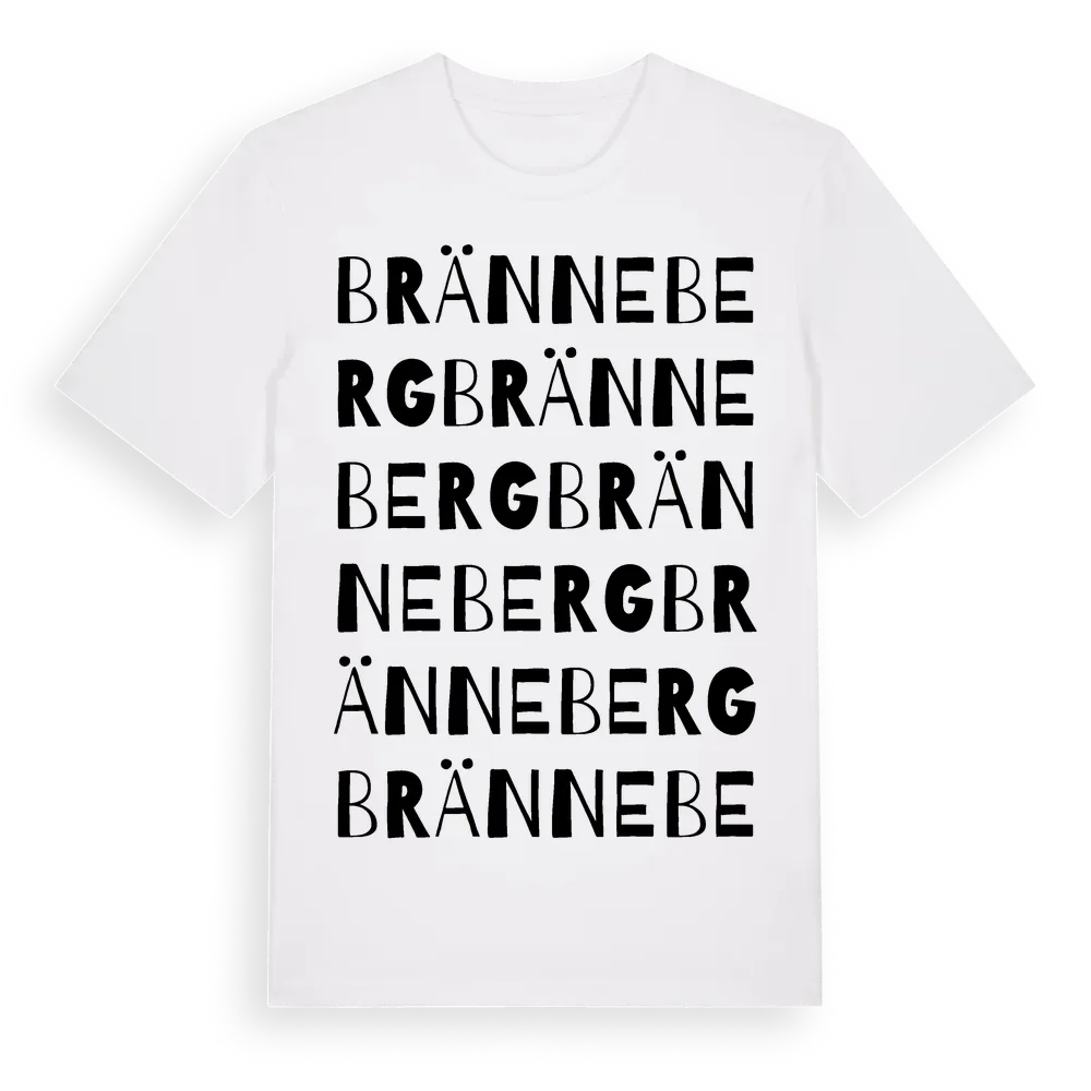 Bränneberg ordlek t-shirt är inspirerad av Bränneberg i Hallands län, Sverige. Tröjan är designad för dig som har en speciell koppling till platsen – oavsett om du bor här, har rötterna här eller bara älskar Bränneberg.