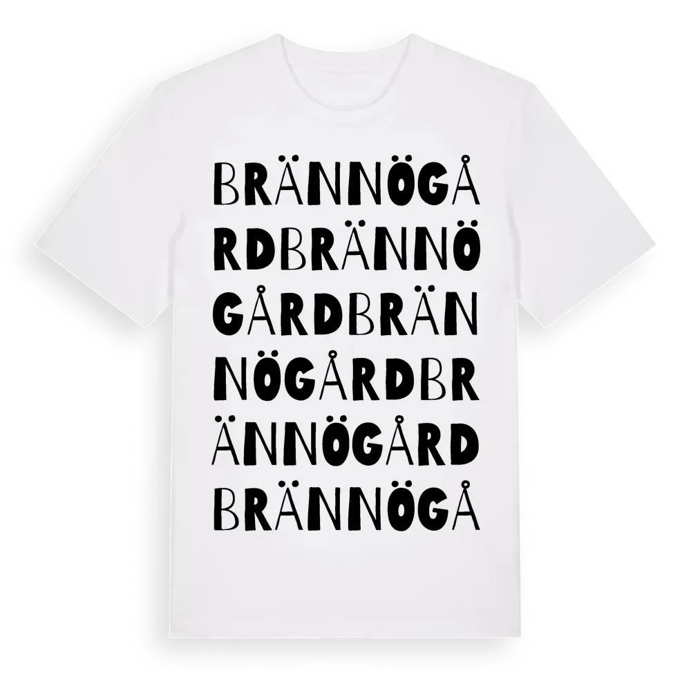 Brännögård ordlek t-shirt är inspirerad av byn Brännögård i Hallands län, Sverige. Tröjan är designad för dig som har en speciell koppling till platsen – oavsett om du bor här, har rötterna här eller bara älskar Brännögård.