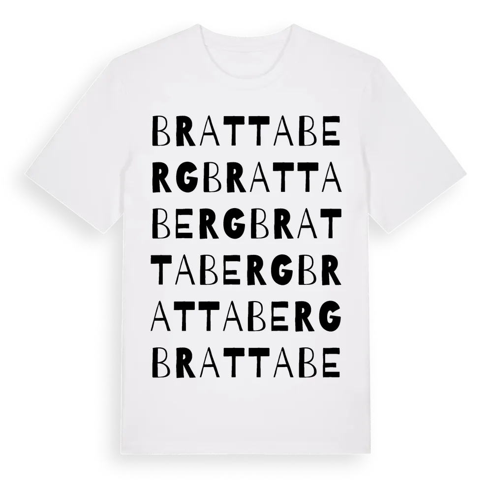 Brattaberg ordlek t-shirt är inspirerad av Brattaberg i Hallands län, Sverige. Tröjan är designad för dig som har en speciell koppling till platsen – oavsett om du bor här, har rötterna här eller bara älskar Brattaberg.