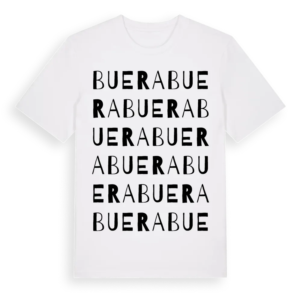 En ordlek byggd på Bueras namn. Subtilt och klurig – ett motiv som bara de som verkligen känner platsen fullt ut förstår. Premium bomull, unisex – från Buera i Hallands län.