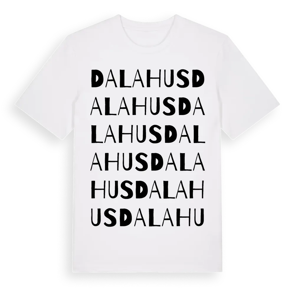 Dalahus ordlek t-shirt är inspirerad av Dalahus i Hallands län, Sverige. Tröjan är designad för dig som har en speciell koppling till platsen – oavsett om du bor här, har rötterna här eller bara älskar Dalahus.