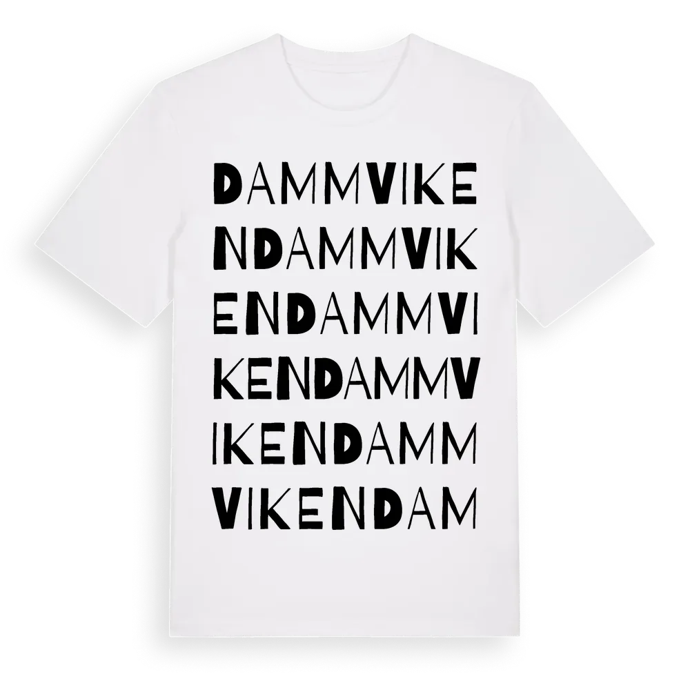 Dammviken ordlek t-shirt är inspirerad av Dammviken i Hallands län, Sverige. Tröjan är designad för dig som har en speciell koppling till platsen – oavsett om du bor här, har rötterna här eller bara älskar Dammviken.