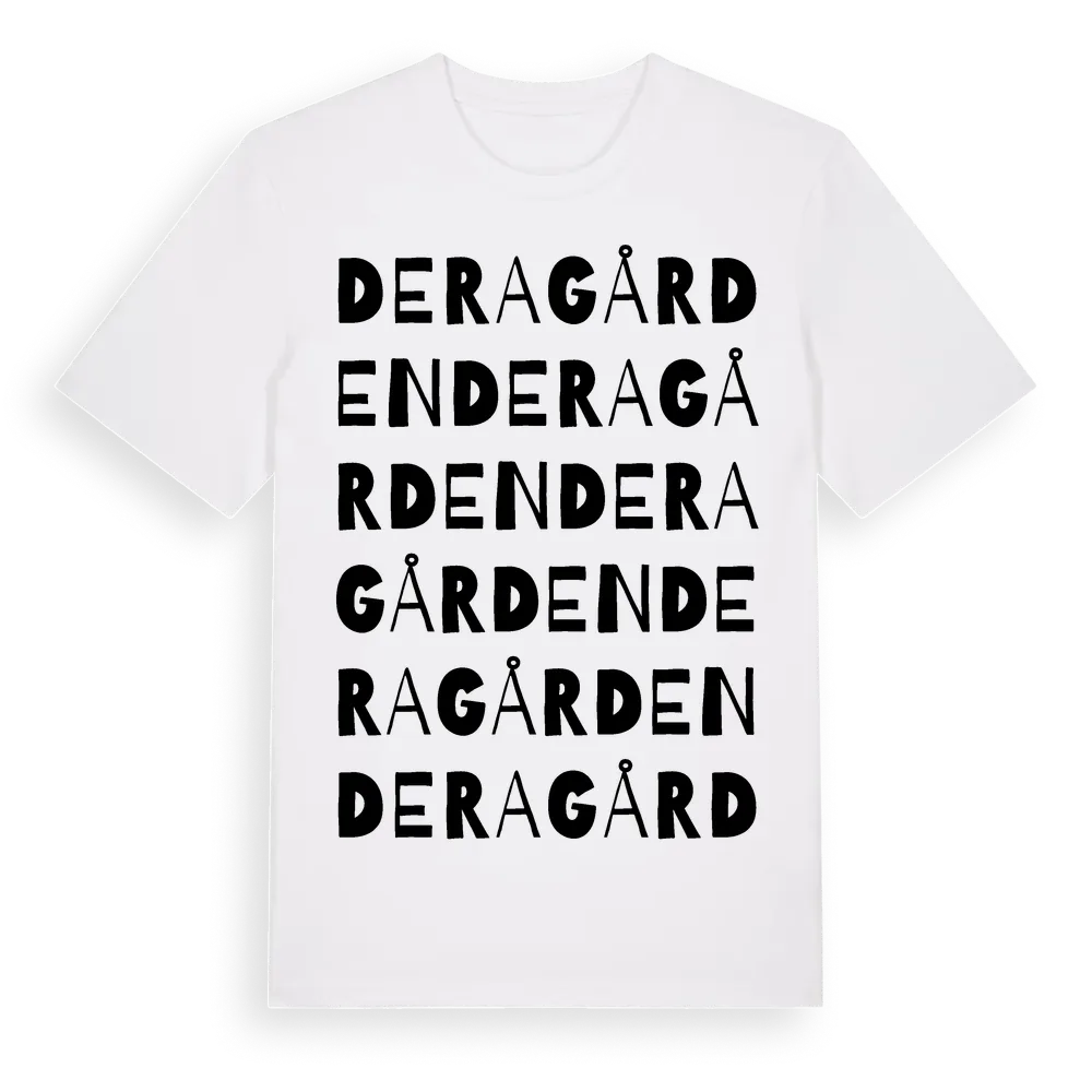 Deragården ordlek t-shirt är inspirerad av Deragården i Hallands län, Sverige. Tröjan är designad för dig som har en speciell koppling till platsen – oavsett om du bor här, har rötterna här eller bara älskar Deragården.