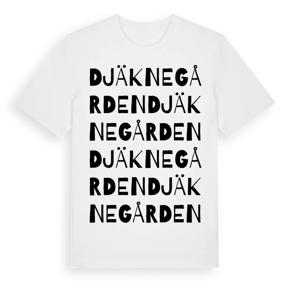 Djäknegården ordlek t-shirt är inspirerad av Djäknegården i Hallands län, Sverige. Tröjan är designad för dig som har en speciell koppling till platsen – oavsett om du bor här, har rötterna här eller bara älskar Djäknegården.