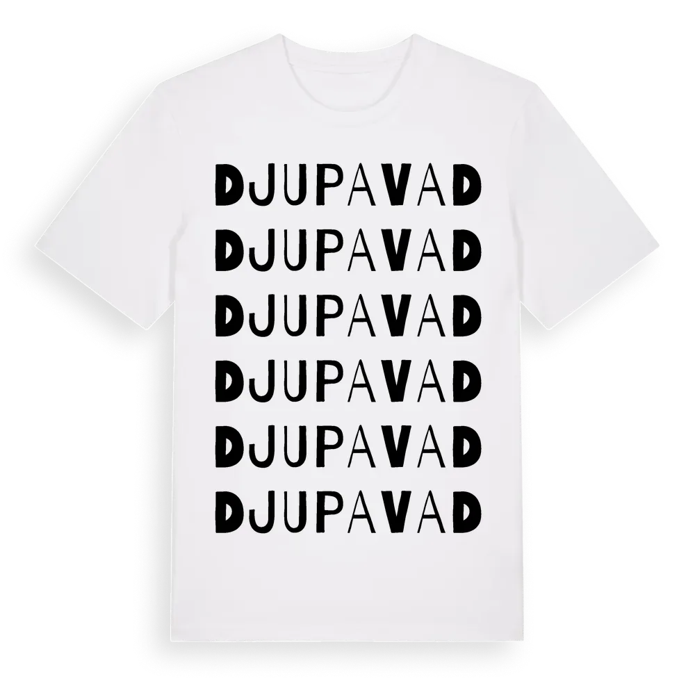 Djupavad ordlek t-shirt är inspirerad av Djupavad i Hallands län, Sverige. Tröjan är designad för dig som har en speciell koppling till platsen – oavsett om du bor här, har rötterna här eller bara älskar Djupavad.