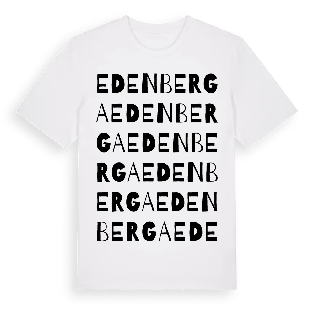 Edenberga ordlek t-shirt är inspirerad av byn Edenberga i Hallands län, Sverige. Tröjan är designad för dig som har en speciell koppling till platsen – oavsett om du bor här, har rötterna här eller bara älskar Edenberga.