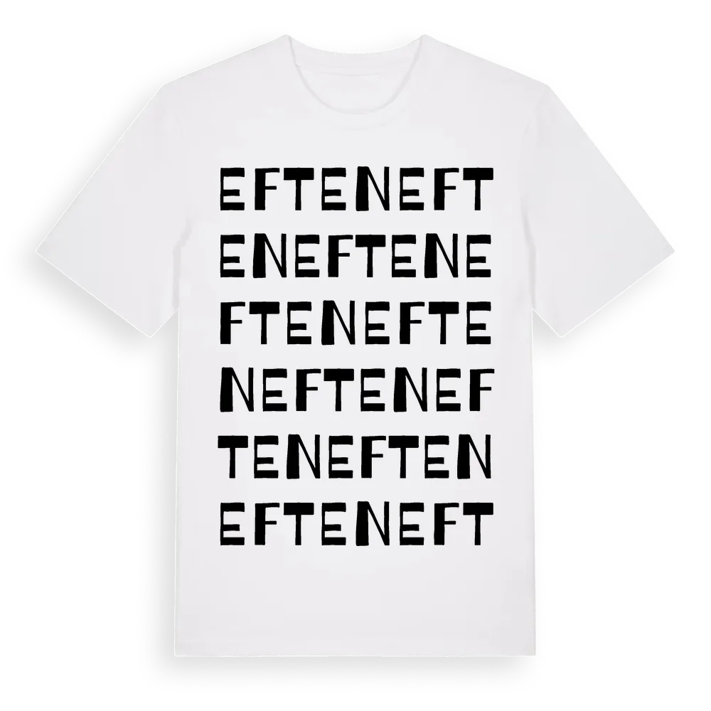 En ordlek byggd på Eftens namn. Subtilt och klurig – ett motiv som bara de som verkligen känner platsen fullt ut förstår. Premium bomull, unisex – från Eften i Hallands län.