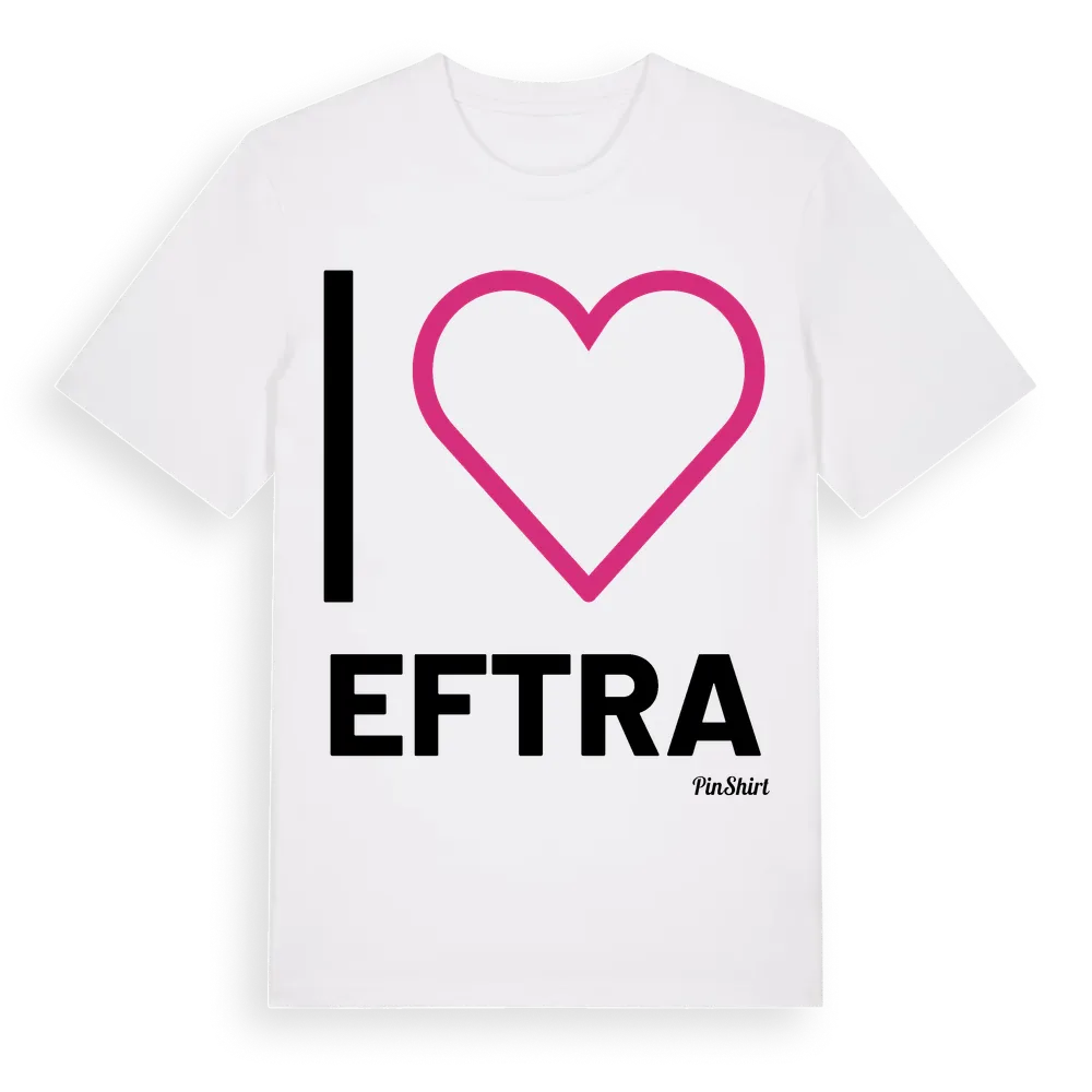 Det klassiska "I ❤ Eftra"-motivet i stort format som täcker hela bröstet. För dig som vill visa kärleken till Eftra på riktigt. Premium bomull, unisex – från byn Eftra i Hallands län.