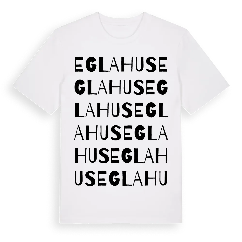 Eglahus ordlek t-shirt är inspirerad av Eglahus i Hallands län, Sverige. Tröjan är designad för dig som har en speciell koppling till platsen – oavsett om du bor här, har rötterna här eller bara älskar Eglahus.