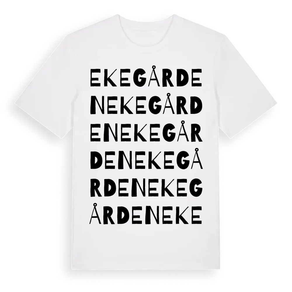 Ekegården ordlek t-shirt är inspirerad av Ekegården i Hallands län, Sverige. Tröjan är designad för dig som har en speciell koppling till platsen – oavsett om du bor här, har rötterna här eller bara älskar Ekegården.