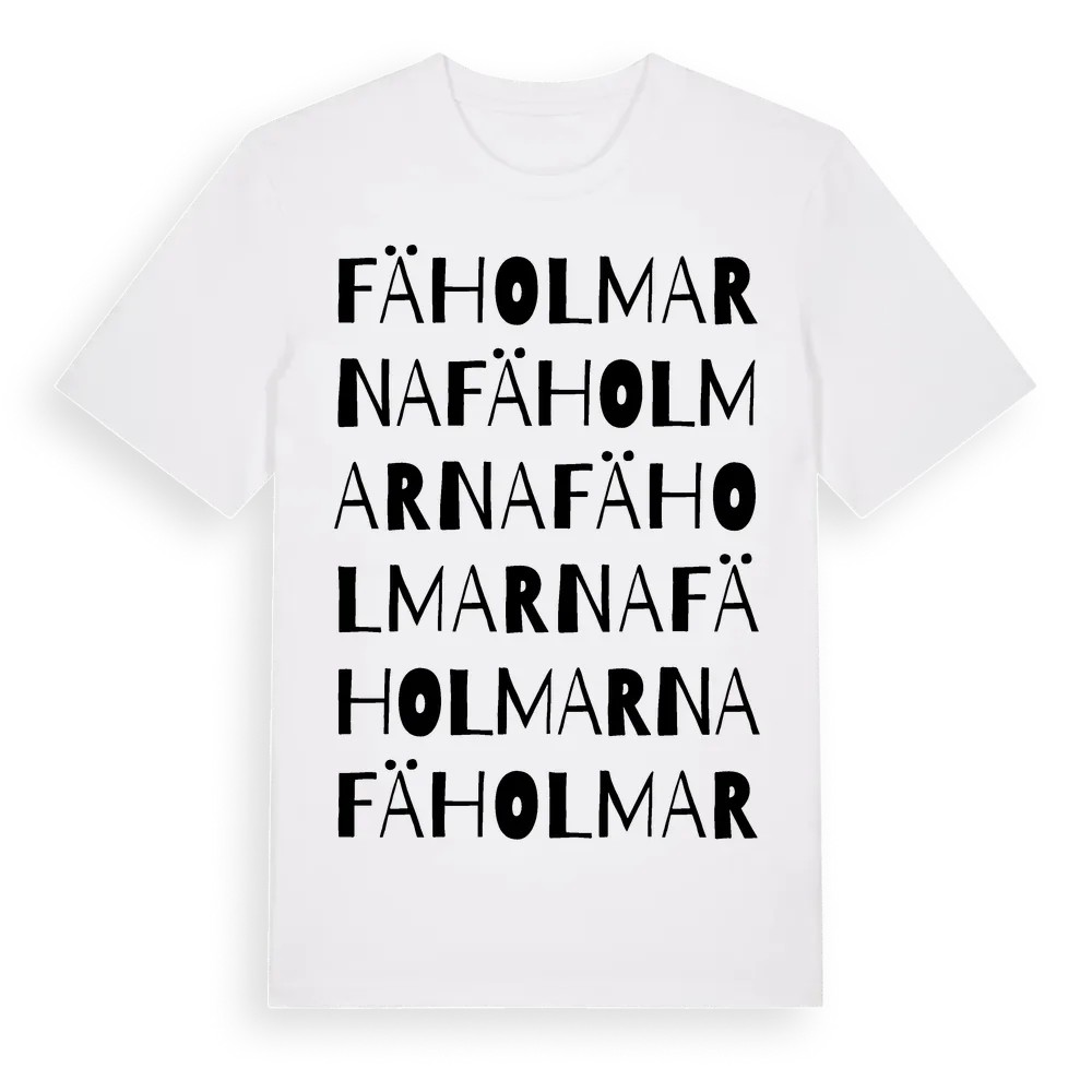 Fäholmarna ordlek t-shirt är inspirerad av Fäholmarna i Hallands län, Sverige. Tröjan är designad för dig som har en speciell koppling till platsen – oavsett om du bor här, har rötterna här eller bara älskar Fäholmarna.