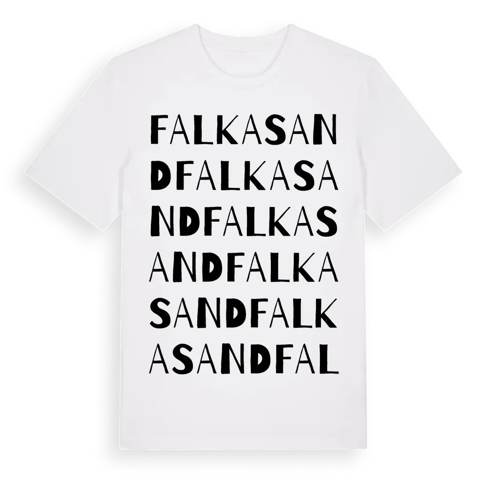 Falkasand ordlek t-shirt är inspirerad av Falkasand i Hallands län, Sverige. Tröjan är designad för dig som har en speciell koppling till platsen – oavsett om du bor här, har rötterna här eller bara älskar Falkasand.