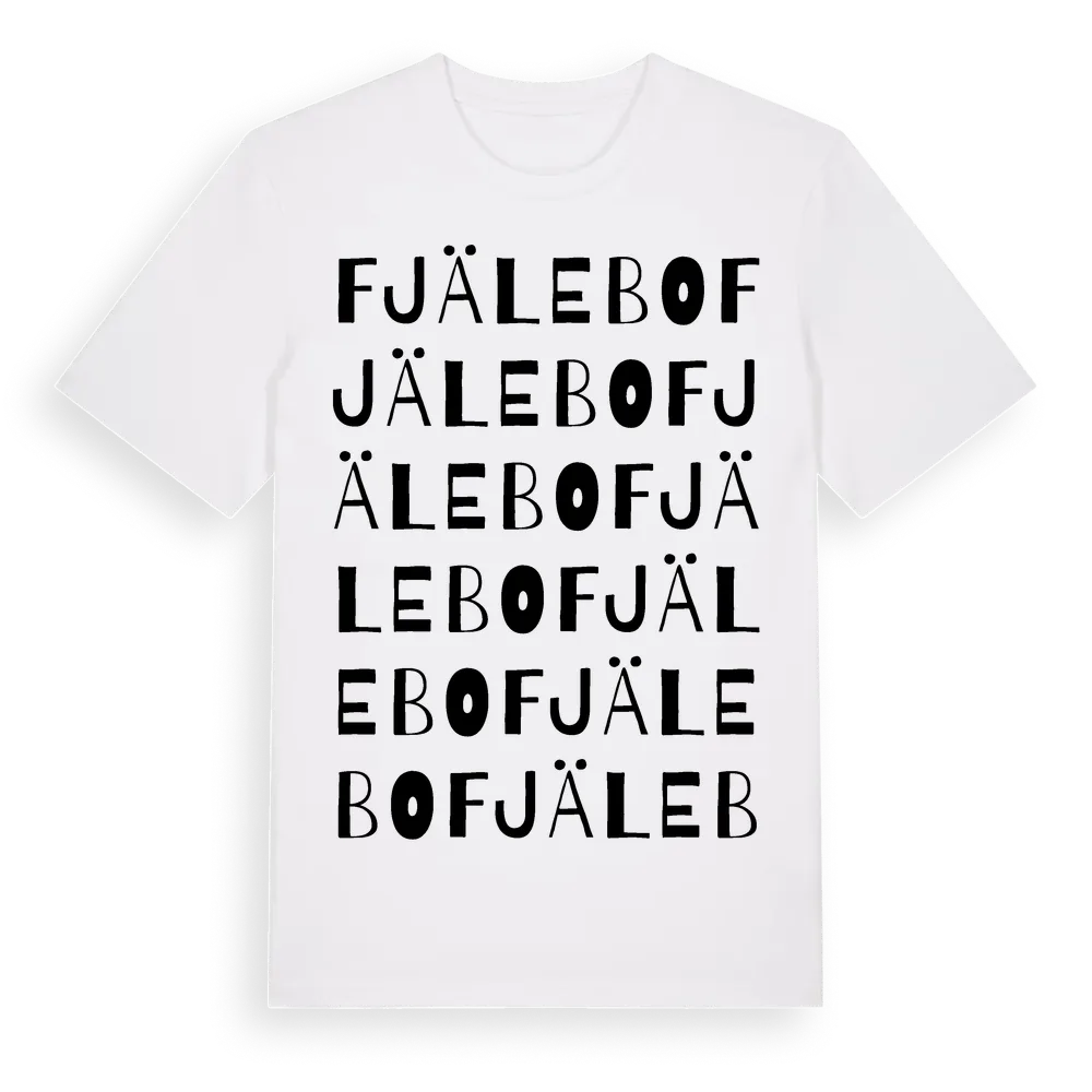 Fjälebo ordlek t-shirt är inspirerad av byn Fjälebo i Hallands län, Sverige. Tröjan är designad för dig som har en speciell koppling till platsen – oavsett om du bor här, har rötterna här eller bara älskar Fjälebo.