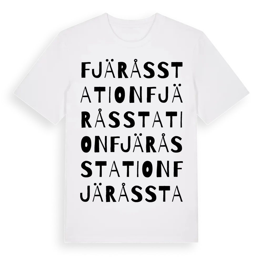Fjärås Station ordlek t-shirt är inspirerad av byn Fjärås Station i Hallands län, Sverige. Tröjan är designad för dig som har en speciell koppling till platsen – oavsett om du bor här, har rötterna här eller bara älskar Fjärås Station.