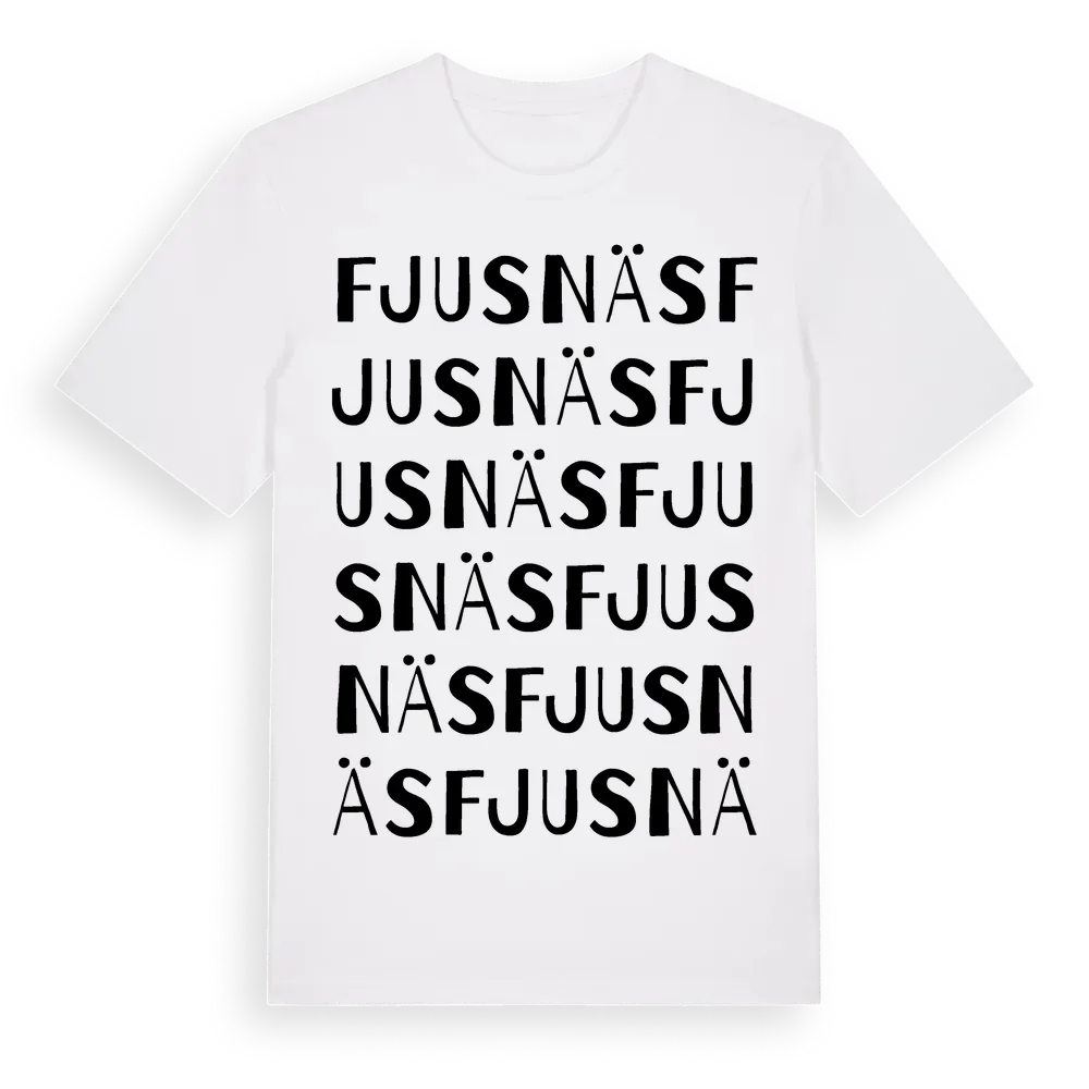 Fjusnäs ordlek t-shirt är inspirerad av byn Fjusnäs i Hallands län, Sverige. Tröjan är designad för dig som har en speciell koppling till platsen – oavsett om du bor här, har rötterna här eller bara älskar Fjusnäs.