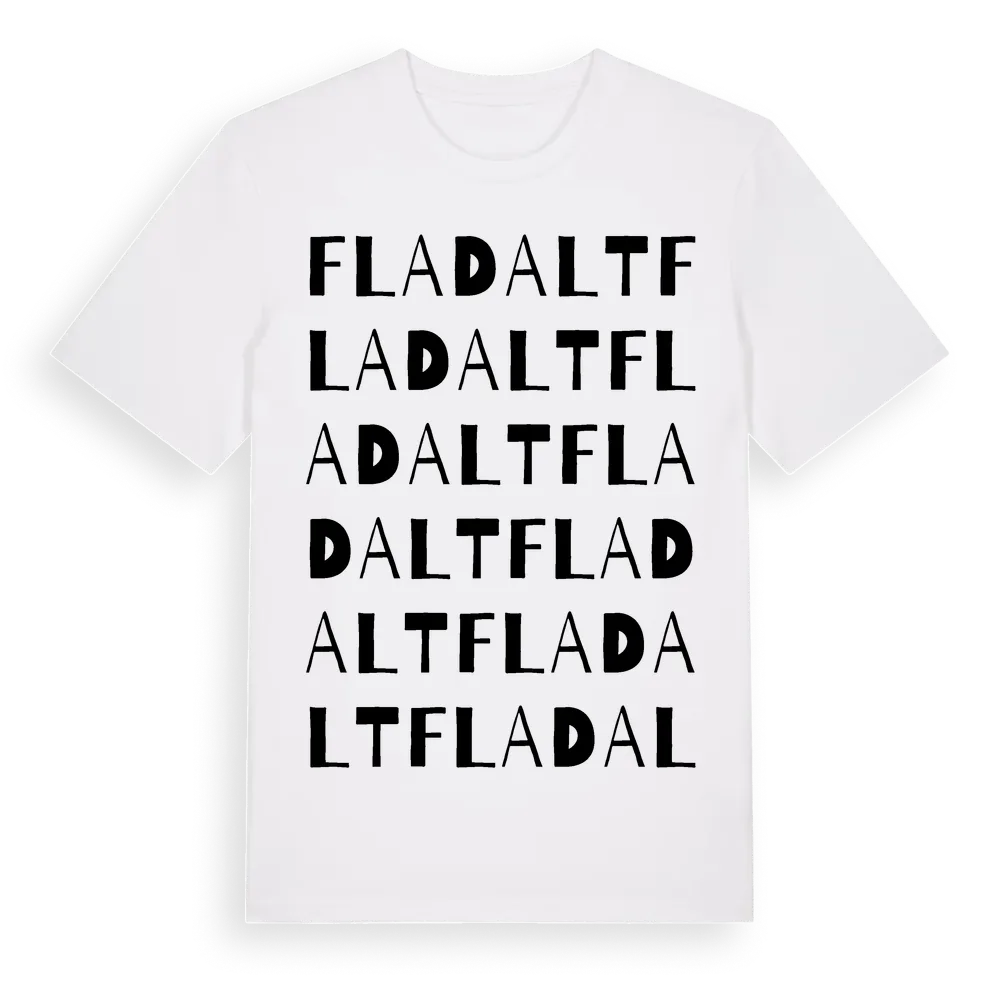 Fladalt ordlek t-shirt är inspirerad av byn Fladalt i Hallands län, Sverige. Tröjan är designad för dig som har en speciell koppling till platsen – oavsett om du bor här, har rötterna här eller bara älskar Fladalt.