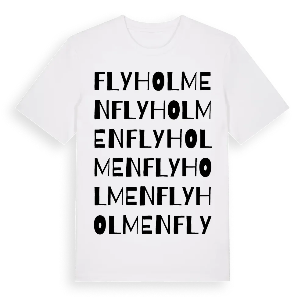 En ordlek byggd på Flyholmens namn. Subtilt och klurig – ett motiv som bara de som verkligen känner platsen fullt ut förstår. Premium bomull, unisex – från byn Flyholmen i Hallands län.