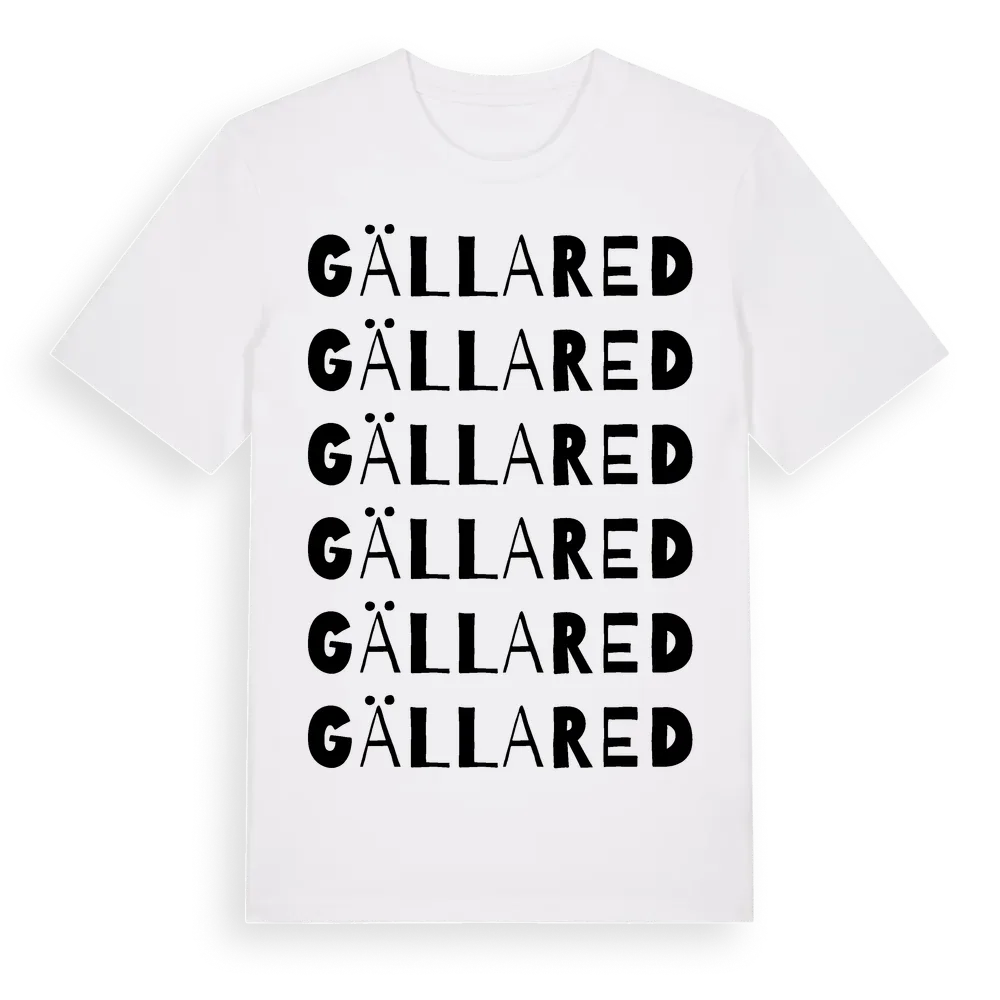Gällared ordlek t-shirt är inspirerad av byn Gällared i Hallands län, Sverige. Tröjan är designad för dig som har en speciell koppling till platsen – oavsett om du bor här, har rötterna här eller bara älskar Gällared.
