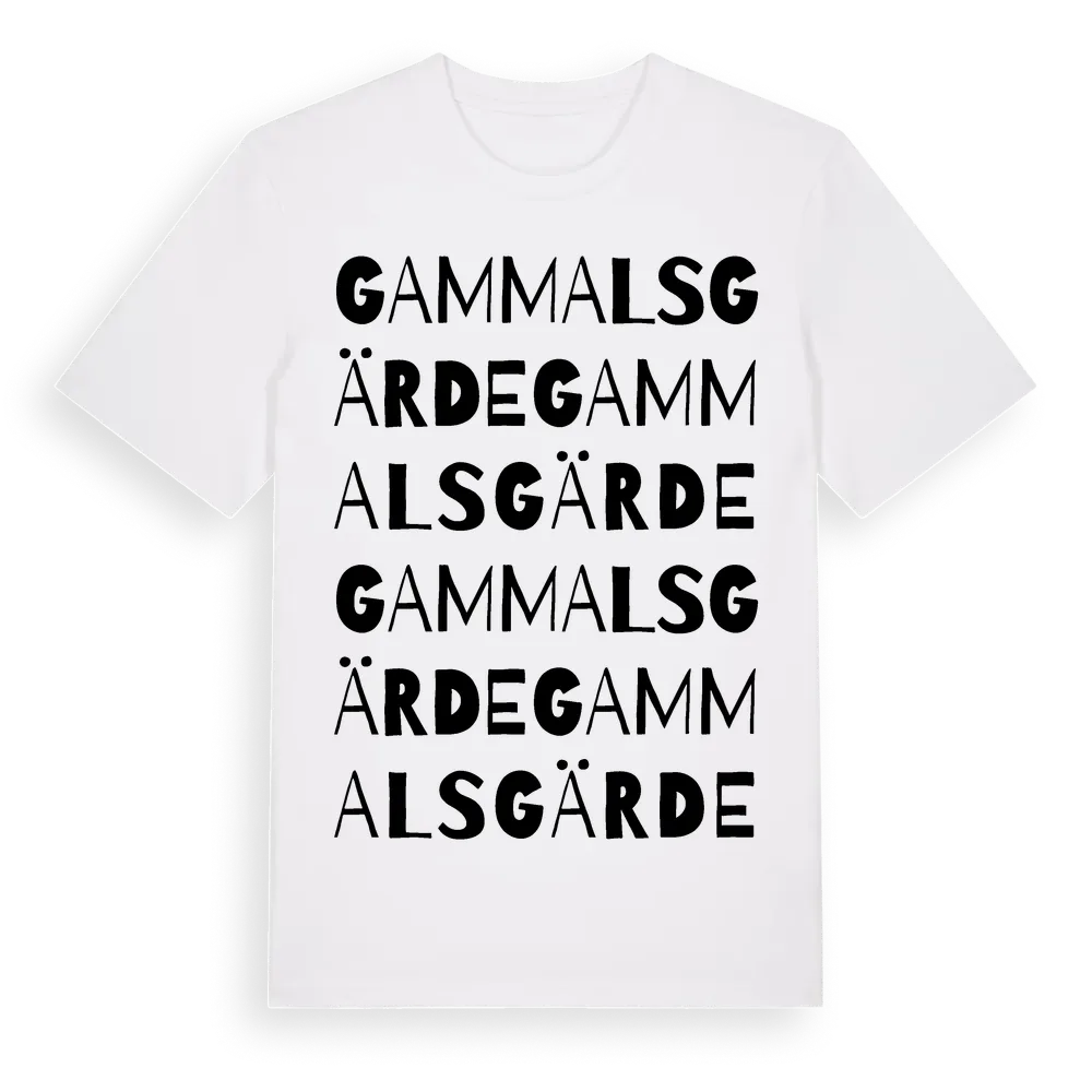 Gammalsgärde ordlek t-shirt är inspirerad av Gammalsgärde i Hallands län, Sverige. Tröjan är designad för dig som har en speciell koppling till platsen – oavsett om du bor här, har rötterna här eller bara älskar Gammalsgärde.