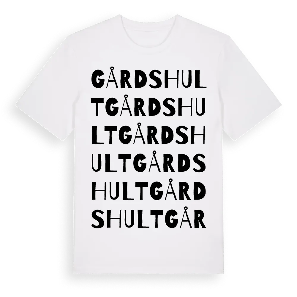 Gårdshult ordlek t-shirt är inspirerad av byn Gårdshult i Hallands län, Sverige. Tröjan är designad för dig som har en speciell koppling till platsen – oavsett om du bor här, har rötterna här eller bara älskar Gårdshult.