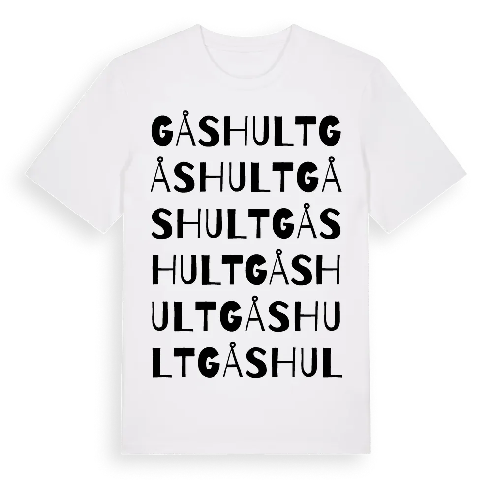 Gåshult ordlek t-shirt är inspirerad av Gåshult i Hallands län, Sverige. Tröjan är designad för dig som har en speciell koppling till platsen – oavsett om du bor här, har rötterna här eller bara älskar Gåshult.