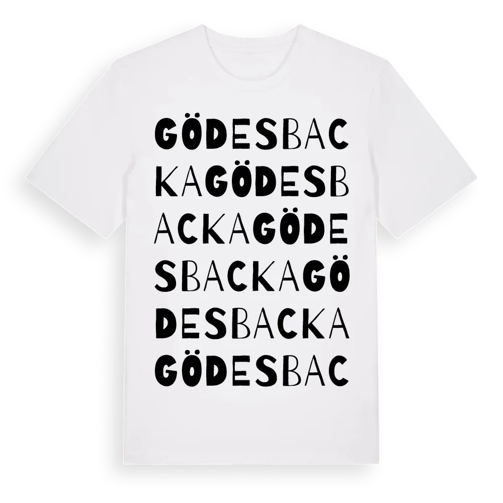 Gödesbacka ordlek t-shirt är inspirerad av Gödesbacka i Hallands län, Sverige. Tröjan är designad för dig som har en speciell koppling till platsen – oavsett om du bor här, har rötterna här eller bara älskar Gödesbacka.