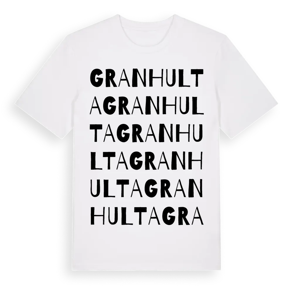 Granhulta ordlek t-shirt är inspirerad av Granhulta i Hallands län, Sverige. Tröjan är designad för dig som har en speciell koppling till platsen – oavsett om du bor här, har rötterna här eller bara älskar Granhulta.
