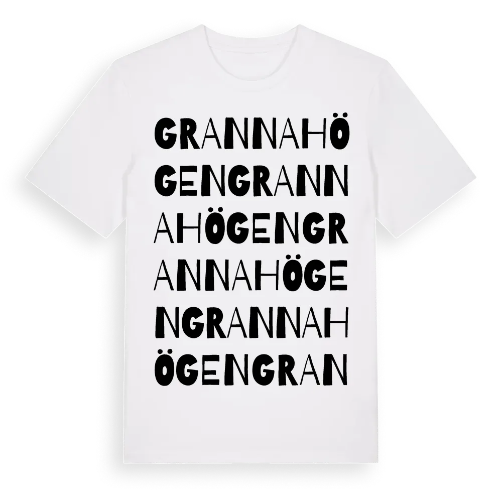 Grannahögen ordlek t-shirt är inspirerad av Grannahögen i Hallands län, Sverige. Tröjan är designad för dig som har en speciell koppling till platsen – oavsett om du bor här, har rötterna här eller bara älskar Grannahögen.