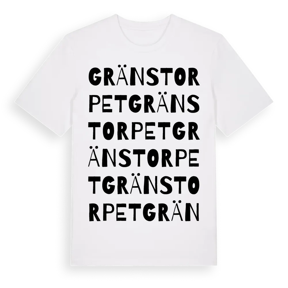 Gränstorpet ordlek t-shirt är inspirerad av Gränstorpet i Hallands län, Sverige. Tröjan är designad för dig som har en speciell koppling till platsen – oavsett om du bor här, har rötterna här eller bara älskar Gränstorpet.