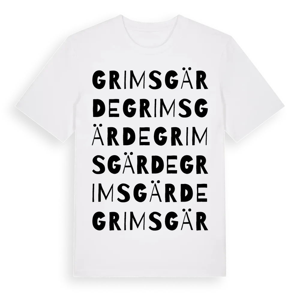 Grimsgärde ordlek t-shirt är inspirerad av Grimsgärde i Hallands län, Sverige. Tröjan är designad för dig som har en speciell koppling till platsen – oavsett om du bor här, har rötterna här eller bara älskar Grimsgärde.