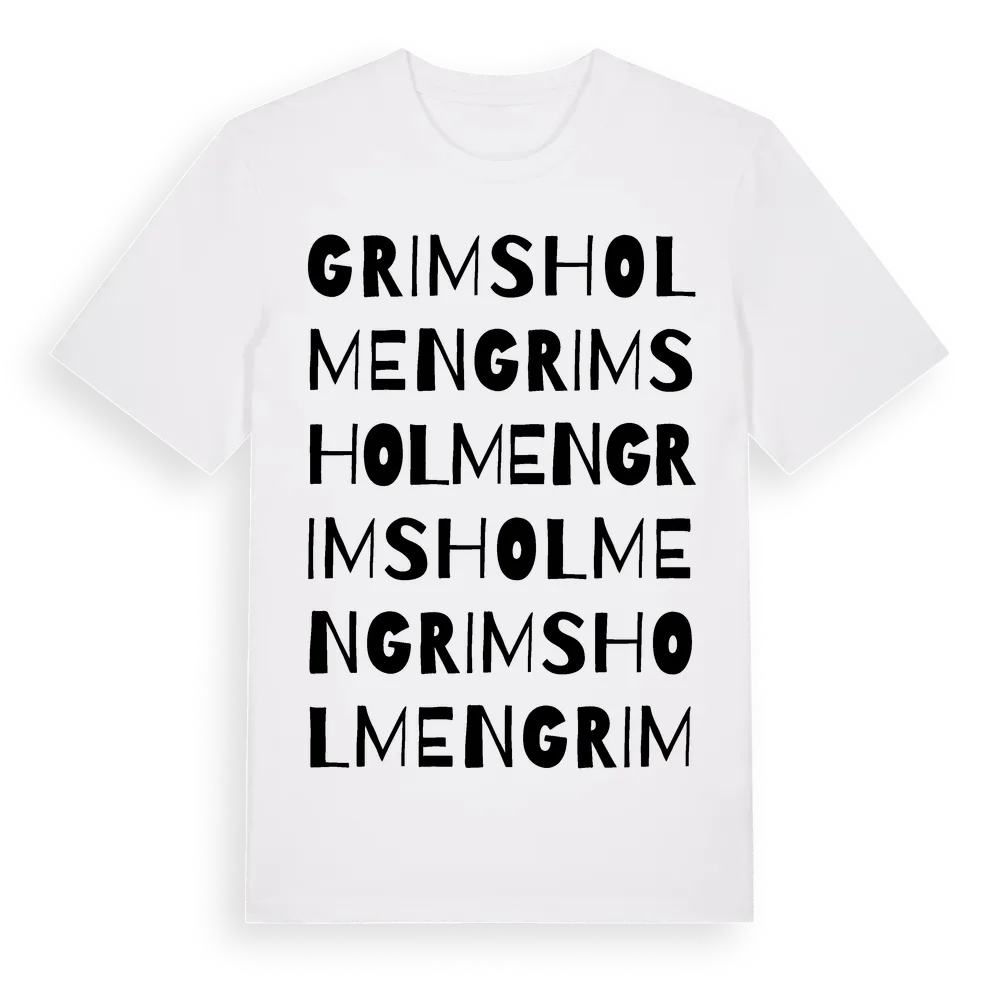 En ordlek byggd på Grimsholmens namn. Subtilt och klurig – ett motiv som bara de som verkligen känner platsen fullt ut förstår. Premium bomull, unisex – från byn Grimsholmen i Hallands län.