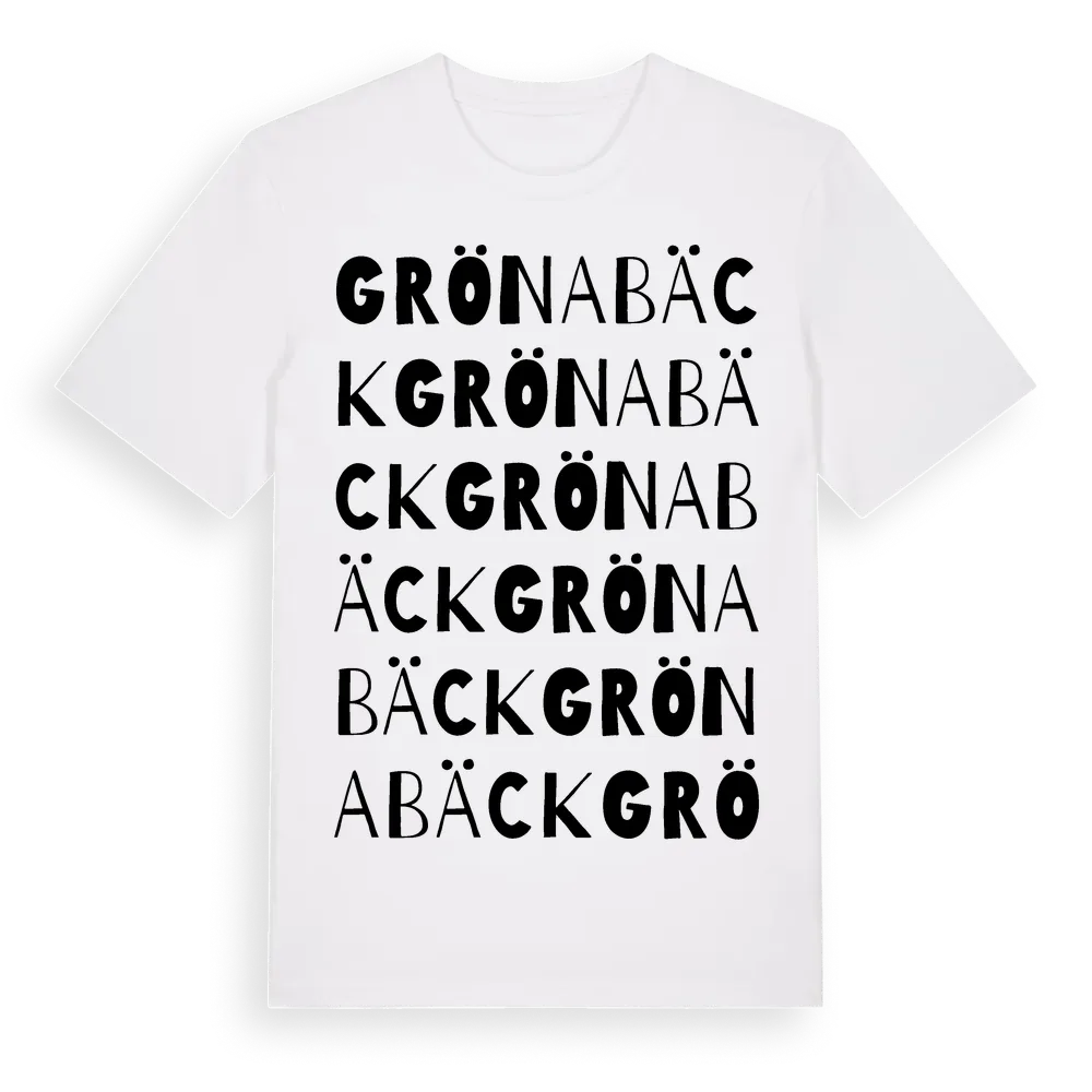 Grönabäck ordlek t-shirt är inspirerad av Grönabäck i Hallands län, Sverige. Tröjan är designad för dig som har en speciell koppling till platsen – oavsett om du bor här, har rötterna här eller bara älskar Grönabäck.
