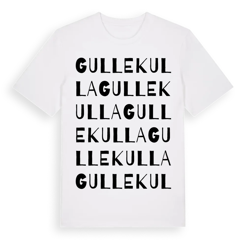 Gullekulla ordlek t-shirt är inspirerad av Gullekulla i Hallands län, Sverige. Tröjan är designad för dig som har en speciell koppling till platsen – oavsett om du bor här, har rötterna här eller bara älskar Gullekulla.